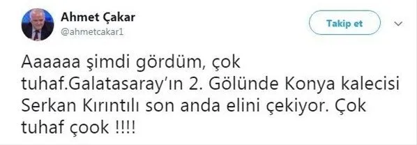 Fatih Terim Tweet'inin ardından bir paylaşımda daha bulunan Çakar, "Aaaaaa şimdi gördüm, çok tuhaf. Galatasaray'ın 2. golünde Konya kalecisi Serkan Kırıntılı son anda elini çekiyor. Çok tuhaf çook!!!" dedi.