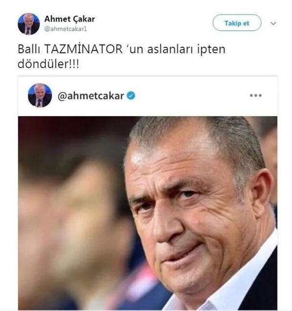 Ahmet Çakar'ın ilk paylaşımı Fatih Terim hakkında oldu. Çakar, maç sonrası attığı Tweet'te, "Ballı TAZMİNATOR'un aslanları ipten döndüler!!!" ifadelerini kullandı.