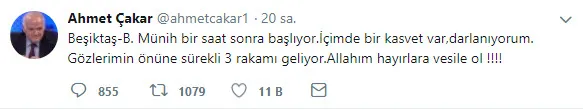 "Beşiktaş-B.Münih bir saat sonra başlıyor. İçimde bir kasvet var, darlanıyorum. Gözlerimin önüne sürekli 3 rakamı geliyor. Allahım hayırlara vesile ol!!!!"