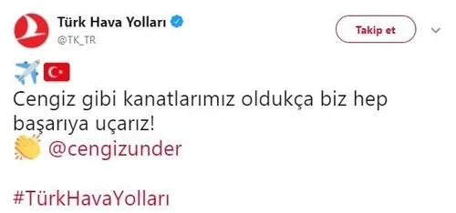 Öte yandan Türk Hava Yolları da Twitter sayfasından yaptığı paylaşımla bu sözlere karşılık verdi. THY tweetinde "Cengiz gibi kanatlarımız oldukça biz hep başarıya uçarız!" ifadelerine yer verildi.