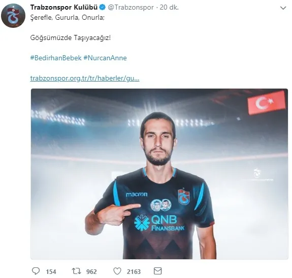 Cagliari ile hazırlık maçı oynayacak Trabzonspor PKK tarafından alçak bir saldırı sonucu şehit edilen Nurcan Karakaya ve 11 aylık bebek Bedirhan Karakaya'yı unutmadı.