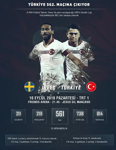 A Milli Futbol Takımı, İsveç ile bu akşam deplasmanda yapacağı UEFA Uluslar B Ligi 2. Grup ikinci maçıyla 562. kez sahaya çıkacak. Türk Milli Takımı, 95 yıllık tarihinde 294'ü resmi, 267'si özel geride kalan 561 maçta, biri hükmen olmak üzere 211 galibiyet aldı, 131 defa berabere kaldı, 219 kez de rakiplerine yenildi.