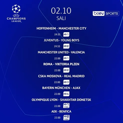 3 Ekim Çarşamba günü saat 22:00'de başlayacak mücadelenin yayıncısı belli oldu. Bein Sports bu hafta içinde oynanacak Şampiyonlar Ligi maçlarını yayınlayacağını açıkladı.