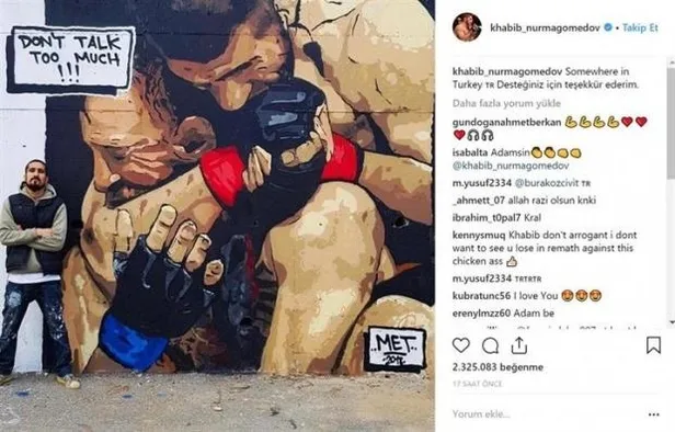 Khabib, ringte verdiği mücadelesini resmeden grafiti sanatçısı Türkmen'in eserini "Somewhere in Turkey Desteğiniz için teşekkür ederim. notuyla 12 milyon takipçisi olan resmi Instagram hesabından paylaştı.