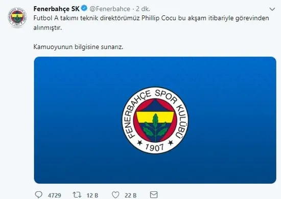 Fenerbahçe Teknik Direktörü Cocu ile yollarını ayırdı. Fenerbahçe resmi Twitter hesabından yapılan açıklamada; "Futbol A takımı teknik direktörümüz Phillip Cocu bu akşam itibariyle görevinden alınmıştır. Kamuoyunun bilgisine sunarız." ifadelerine yer verildi.