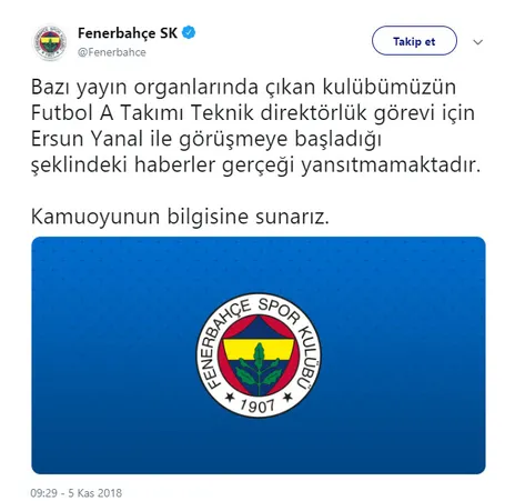 "Bazı yayın organlarında çıkan kulübümüzün Futbol A Takımı Teknik direktörlük görevi için Ersun Yanal ile görüşmeye başladığı şeklindeki haberler gerçeği yansıtmamaktadır. Kamuoyunun bilgisine sunarız."