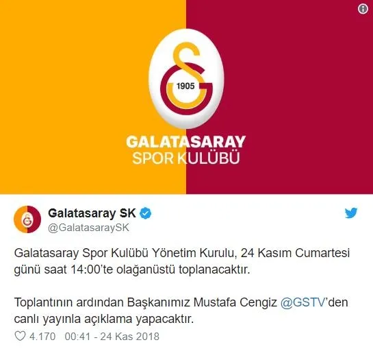 "Galatasaray Spor Kulübü Yönetim Kurulu, 24 Kasım Cumartesi günü saat 14:00'te olağanüstü toplanacaktır. Toplantının ardından Başkanımız Mustafa Cengiz, canlı yayınla açıklama yapacaktır."
