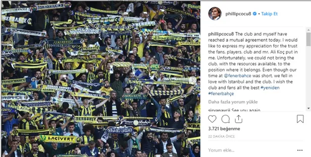 "Taraftarlara, oyunculara, kulübe ve Ali Koç'a bana güvendikleri için teşekkür ederim. Maalesef Fenerbahçe'yi mevcut kaynaklarla hak ettiği yere ulaştıramadık. Taraftarlara ve Fenerbahçe'ye en iyisini diliyorum."