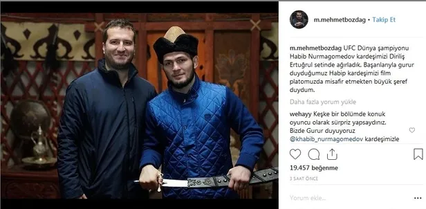 "UFC Dünya şampiyonu Habib Nurmagomedov kardeşimizi Diriliş Ertuğrul setinde ağırladık. Başarılarıyla gurur duyduğumuz Habip kardeşimizi film platomuzda misafir etmekten büyük şeref duydum."