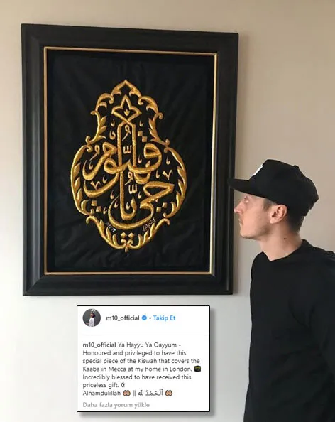 Kiswa adı verilen Kâbe örtüsünden bir parçasının çerçevelenmiş ve duvara asılmış halinin görüntüsünü paylaşan Mesut Özil fotoğrafla birlikte şu mesajı yayınladı: