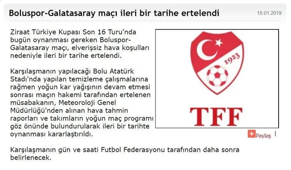 Ziraat Türkiye Kupası Son 16 Turu'nda bugün oynanması gereken Boluspor-Galatasaray maçı, elverişsiz hava koşulları nedeniyle ileri bir tarihe ertelendi.