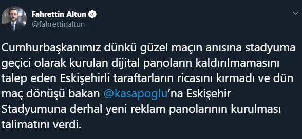 Cumhurbaşkanlığı İletişim Başkanı Fahrettin Altun Twitter hesabından yaptığı paylaşımda, Başkan Erdoğan'ın Eskişehirsporlu taraftarlarının dijital reklam panolarının kalması yönündeki isteklerini kırmadığını ve Gençlik ve Spor Bakanı Mehmet Kasapoğlu'na yeni reklam panolarının kurulmasının talimatını verdiğini açıkladı.
