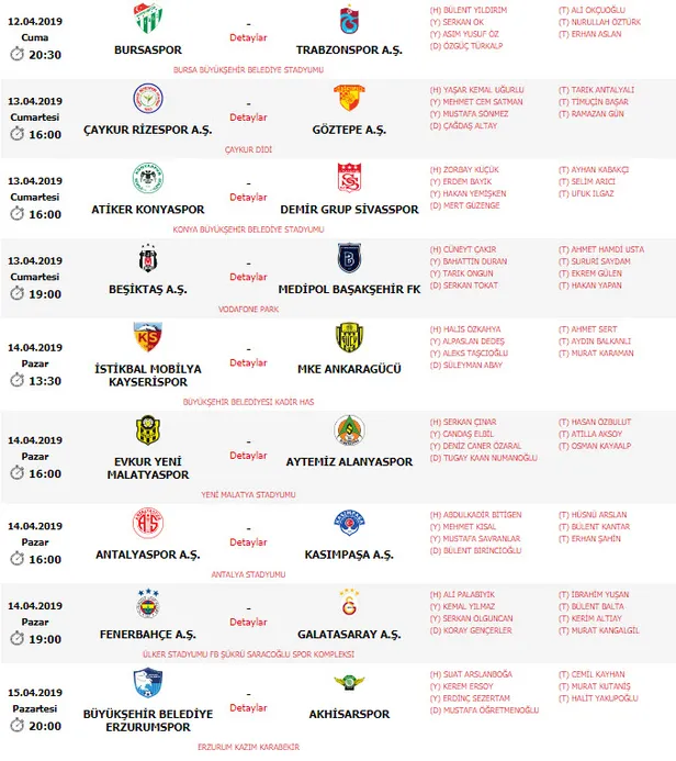 Süper Lig'in 28. haftasındaki maç programı ve karşılaşmalarda düdük çalacak hakemler şöyle: