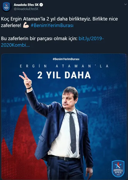 "Takımımızda üçüncü dönemini sürdüren teknik patron Ergin Ataman ile iki yıllık sözleşme tazeledik. Ataman, bilindiği gibi takımımızı 1999-2001 yılları arasında, 2008-09 ve 2009-10 sezonlarında çalıştırmış ve 2017-18 sezonu ortasında üçüncü kez takımımızın başına geçmişti.