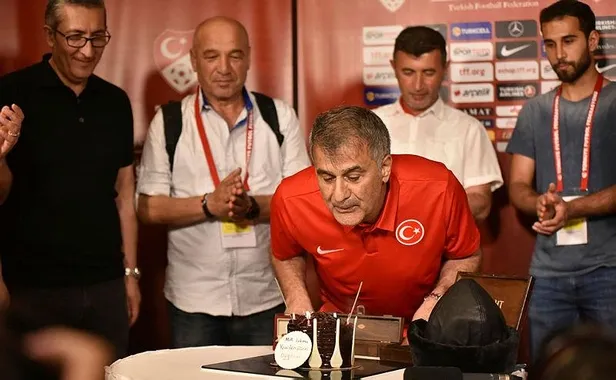 Şenol Güneş, üzerinde, 'Milli takıma yeniden güneş doğdu' yazısı bulunan pastadaki mumu üflerken, Avrupa Şampiyonasına katılmayı diledi. Güneş daha sonra kendisine hediye edilen kalpağı taktı.