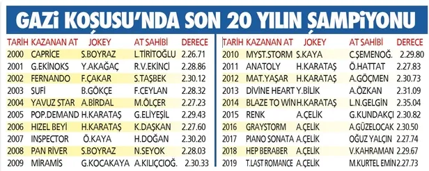 Gazi Koşusu, dün İstanbul Veliefendi Hipodromu'nda koşuldu. 21 tayın katılımıyla çim pistte gerçekleşen 2 bin 400 metre mesafeli Gazi Koşusu'nu Melis Kurtel Emin'in sahibi olduğu ve Ahmet Çelik'in jokeyliğini yaptığı The Last Romance isimli safkan 2.27.73'lük derecesi ile kazandı. Ahmet Çelik üst üste 5'inci kez Gazi Koşusu'nda gülen isim oldu. Ödülü İstanbul BŞB. Başkanı Ekrem İmamoğlu verdi.