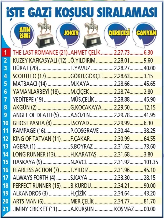 Dişi tay The Last Romance şampiyon. Türk yarışçılığının derbisinde jokey Ahmet Çelik, finişi görenilk isimdi... Çelik, üst üste 5. kez Gazi Koşusu’nda zirvenin en tepesinde yer aldı...