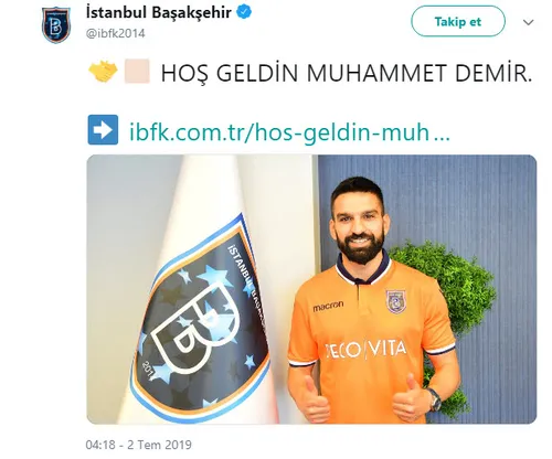 Medipol Başakşehir, geçtiğimiz yıl Sivasspor'da forma giyen tecrübeli golcü Muhammet Demir'i renklerine kattı. İstanbul ekibi transferi twitterdan paylaştığı video ile duyururken, resmi sitesinde yayınladığı mesajla da golcü oyuncuya "Hoş geldin Muhammet Demir" dedi.
