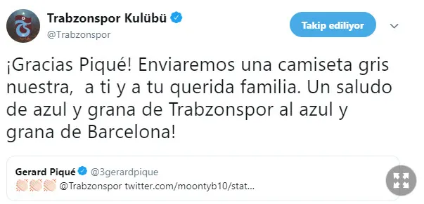 Pique'nin bu paylaşımına Trabzonspor da kayıtsız kalmadı. Bordo mavili ekip, İspanyol yıldıza "Teşekkürler Pique, sana ve güzel ailene gri formamızı göndereceğiz. Bordo mavi Trabzonspor'dan bordo mavi Barcelona'ya selamlar" mesajı gönderdi.