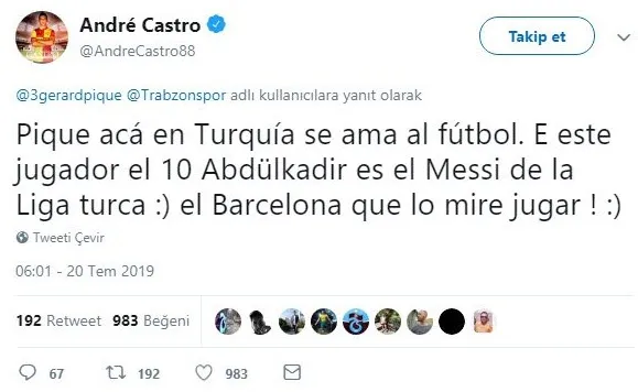 Pique'nin bu paylaşımının altına yorum yapanlardan biri de Göztepeli Andre Castro oldu. Portekizli oyuncu yaptığı yorumda "Türkiye'de futbol çok seviliyor, Pique. Videodaki oyuncu 'Türkiye'nin Messi'si' olarak bilinen Abdülkadir. Barcelona onu mutlaka izlemeli" ifadelerini kullandı.