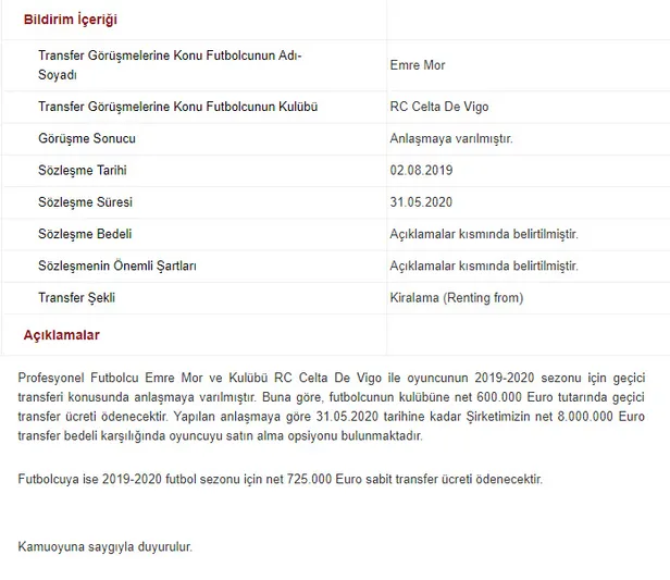 Profesyonel Futbolcu Emre Mor ve Kulübü RC Celta De Vigo ile oyuncunun 2019-2020 sezonu için geçici transferi konusunda anlaşmaya varılmıştır. Buna göre, futbolcunun kulübüne net 600.000 Euro tutarında geçici transfer ücreti ödenecektir. Yapılan anlaşmaya göre 31.05.2020 tarihine kadar Şirketimizin net 8.000.000 Euro transfer bedeli karşılığında oyuncuyu satın alma opsiyonu bulunmaktadır.