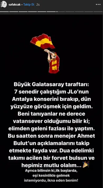 "Büyük Galatasaray taraftarı: 7 senedir çalıştığım Jennifer Lopez'in Antalya konserini bırakıp, dün yüzyüze görüşmek için geldim. Beni tanıyanlar ne derece vatansever olduğmuu bilir ki; elimden geleni fazlası ile yaptım. Bu saatten sonra menajer Ahmet Bulut'un açıklamalarını takip etmekte fayda var. Dua edelim ki takımı acilen forvet bulsun ve hepimiz mutlu olalım. Ayrıca bilinsin ki ilk başlarda, eşi kesinlikle gelmek istemiyordu, ikna eden benim..."