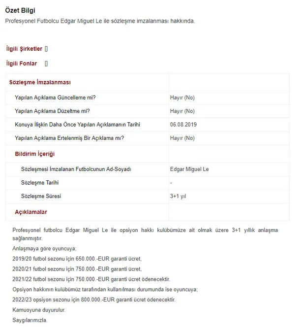 Profesyonel futbolcu Edgar Miguel Le ile opsiyon hakkı kulübümüze ait olmak üzere 3+1 yıllık anlaşma sağlanmıştır.