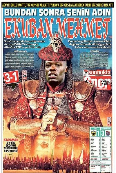 Trabzonspor'un AEK deplasmanında aldığı 3-1'lik galibiyet yerel basında manşetleri süsledi. Photoshop yardımıyla Ekuban'ı Fatih Sultan Mehmet gibi gösteren Son Nokta, "Bundan sonra senin adın "Ekuban Mehmet" dedi. Karadeniz ise, "Yalnız Türkiye değil, Avrupa sana kurban Ekuban" ifadesini kullandı.