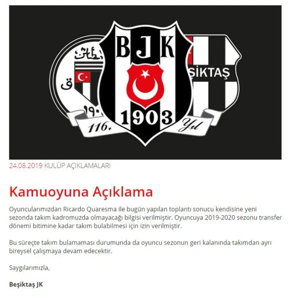 Siyah beyazlı kulüpten yapılan açıklamada şu ifadeler kullanıldı; "Oyuncularımızdan Ricardo Quaresma ile bugün yapılan toplantı sonucu kendisine yeni sezonda takım kadromuzda olmayacağı bilgisi verilmiştir. Oyuncuya 2019-2020 sezonu transfer dönemi bitimine kadar takım bulabilmesi için izin verilmiştir.