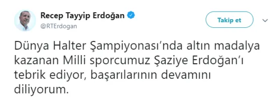 Erdoğan mesajında, "Dünya Halter Şampiyonası'nda altın madalya kazanan Milli sporcumuz Şaziye Erdoğan'ı tebrik ediyor, başarılarının devamını diliyorum." ifadelerine yer verdi.
