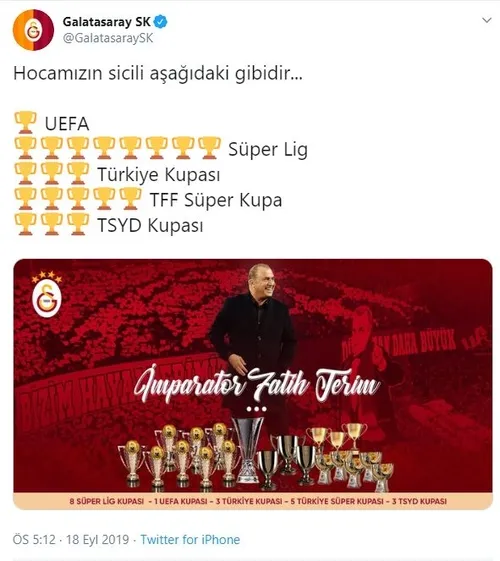 Ali Koç'un "Terim'in sicili bozuk" sözlerine G.Saray deneyimli hocanın kazandığı kupaları "Hocamızın sicili aşağıdaki gibidir" diyerek yanıt verdi.
