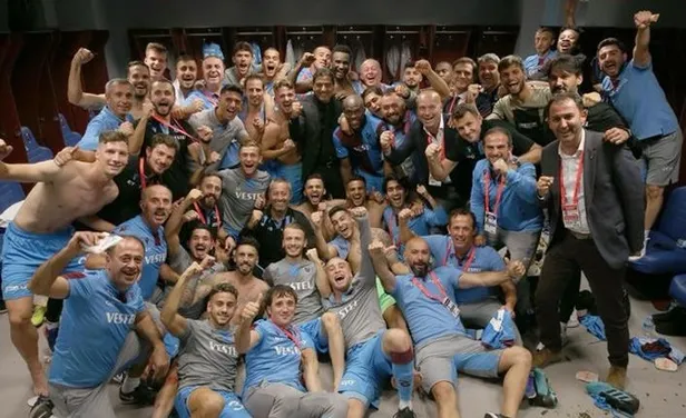 Beşiktaş'ı 4-1 gibi farklı bir skorla mağlup eden Trabzonspor'da maç sonunda büyük bir sevinç yaşandı. Futbolcular ve teknik heyet soyunma odasında 'zafer pozu" verdiler.