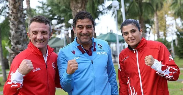 Dünya Kadınlar Boks Şampiyonası 69 kilo finalinde altın madalya kazanan Busenaz Sürmeneli ve antrenörü Cahit Süme Mehmet Ali Yılmaz Tesisleri'nde Trabzonspor Teknik Direktörü Ünal Karaman'ı ziyaret etti.