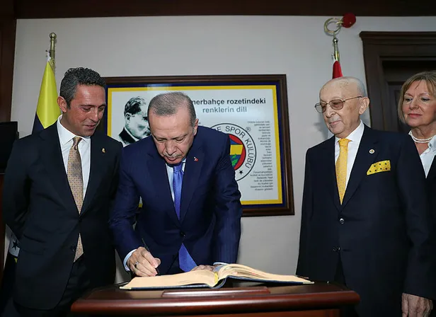 Cumhurbaşkanı Erdoğan, Fenerbahçe'nin 'özel anı defterini' imzaladı ve toplantının gerçekleştiği salona geçti. Başkan Erdoğan, Fenerbahçe Divan Kurulu'nda ayakta alkışlarla karşılandı.
