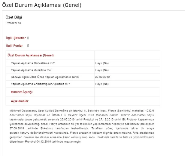 ''Mülkiyeti Galatasaray Spor Kulübü Derneğine ait İstanbul İli, Bakırköy İlçesi, Florya (Şenlikköy) mahallesi 1032/6 Ada/Parsel sayılı taşınmaz ile İstanbul İli, Beykoz İlçesi, Riva Mahallesi 0/3201, 0/3202 Ada/Parsel sayılı taşınmazlar proje geliştirmek amacıyla 26.06.2016 tarihli Protokol ve 27.12.2016 tarihli Ek Protokol kapsamında Şirketimize devredilmiş, ancak Florya arsasının fiili yer tesliminin yapılamaması nedeniyle söz konusu protokoller 27.09.2019 tarihinde Şirketimiz tarafından feshedilmiştir. Tarafların süreç içerisinde tekrar bir araya gelerek konuyu değerlendirmeleri neticesinde, Florya arsasının kapsam dışında bırakılmasına, Riva arsalarında geliştirilen projenin ise devam etmesine karar verilmiş olup konu hakkında tarafların hak ve yükümlülüklerini düzenleyen Protokol 04.12.2019 tarihinde imzalanmıştır.''