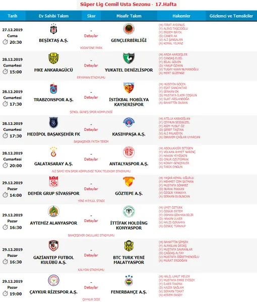 Süper Lig'de ilk yarının son haftasında görev alacak hakemler, Türkiye Futbol Federasyonu'nun (TFF) resmi sitesinden duyuruldu. Fenerbahçe-Beşiktaş derbisinde tartışmalı kararlara imza atan hakemlerin, bu hafta maç alamaması dikkat çekti.