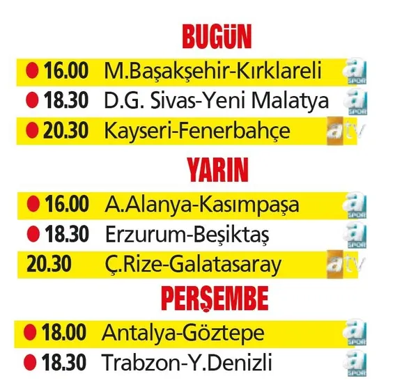 Günün ilk maçında ise Medipol Başakşehir, Kırklarelispor'u saat 16.00'da konuk edecek. Bu maçın hakemi ise Mustafa Öğretmenoğlu. Diğer maçta Demir Grup Sivasspor ile BTC Türk Yeni Malatyaspor karşı karşıya gelecek.