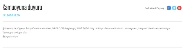 "Şirketimiz ile Ogenyi Eddy Onazi arasındaki, 04.08.2016 başlangıç 31.05.2020 bitiş tarihli profesyonel futbolcu sözleşmesi, karşılıklı olarak feshedilmiştir.