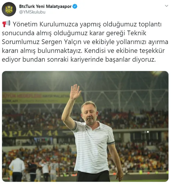 Son dakika transfer haberi... Süper ekiplerinden Lig Yeni Malatyaspor'da Teknik Direktör Sergen Yalçın ile yollar ayrıldı. Sarı siyahlı kulüp, yaptığı resmi açıklamada; "Yönetim Kurulumuzca yapmış olduğumuz toplantı sonucunda almış olduğumuz karar gereği Teknik Sorumlumuz Sergen Yalçın ve ekibiyle yollarımızı ayırma kararı almış bulunmaktayız. Kendisi ve ekibine teşekkür ediyor bundan sonraki kariyerinde başarılar diyoruz." ifadelerini kullandı.