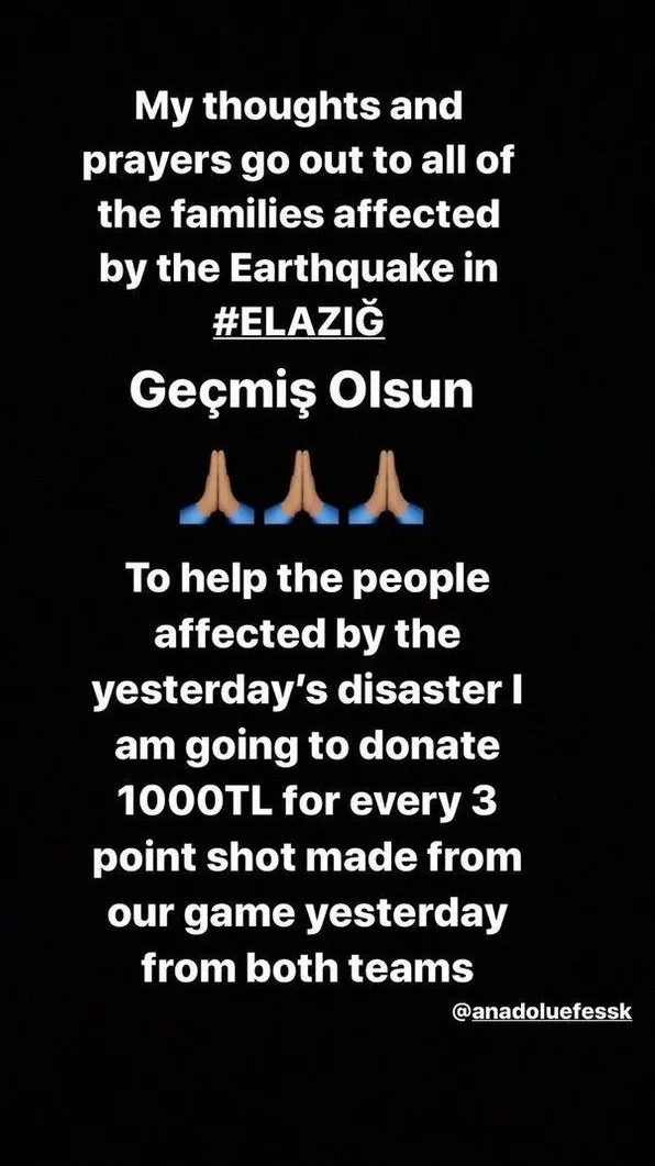 Twitter hesabından paylaşımda bulunan milli basketbolcu, "Bu akşam oynayacağımız Cleveland Cavaliers-Chicago Bulls maçında atılacak her 3 sayılık basket için Elazığ'daki depremin mağdurlarına 100 dolar bağışta bulunacağım. Haydi, atabildiğimiz kadar atıyoruz." ifadelerini kullandı.
