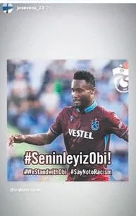 Obi Mikel'e yapılan ırkçı saldırı sonrası Trabzonspor taraftarının yanı sıra diğer kulüp taraftarları da Nijeryalı oyuncuya destek mesajları paylaştı.