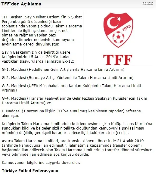 TFF Başkanı Sayın Nihat Özdemir'in 6 Şubat Perşembe günü düzenlediği basın toplantısında yapmış olduğu Takım Harcama Limitleri ile ilgili açıklamaları çok net olmasına rağmen yapılan bazı değerlendirmeler nedeniyle kamuoyunu aydınlatma gereği duyulmuştur.