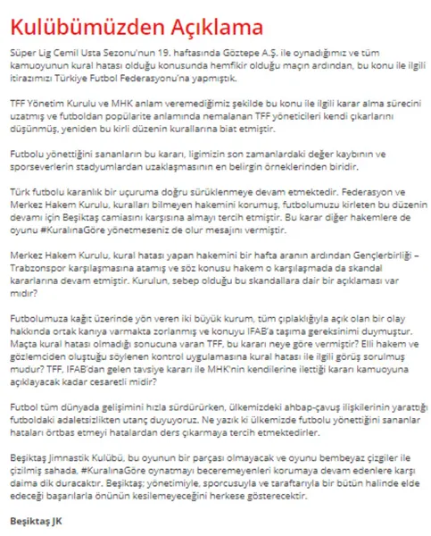 Bu karar sonrası Beşiktaş'ın web sitesinden sert bir açıklama yapıldı. Açıklamada şu ifadelere yer verildi: