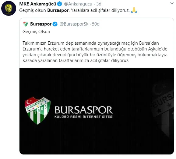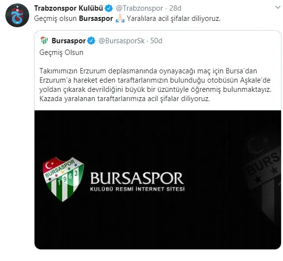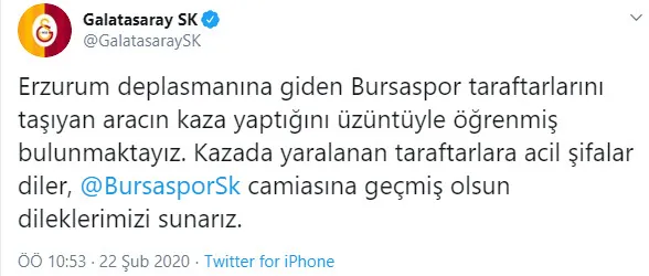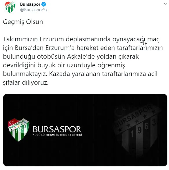 "Takımımızın Erzurum deplasmanında oynayacağı maç için Bursa'dan Erzurum'a hareket eden taraftarlarımızın bulunduğu otobüsün Aşkale'de yoldan çıkarak devrildiğini büyük bir üzüntüyle öğrenmiş bulunmaktayız. Kazada yaralanan taraftarlarımıza acil şifalar diliyoruz."