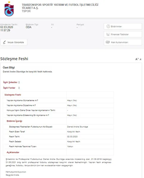 Şirketimiz ile Profesyonel Futbolcumuz Daniel Andre Sturridge arasında imzalanmış olan, 21.08.2019 başlangıç 31.05.2021 bitiş tarihli profesyonel futbolcu sözleşmesi karşılıklı olarak feshedilmiştir. Yapılan fesih anlaşması gereğince, futbolcu, ileriye dönük tüm hak ve alacaklarından vazgeçmiştir.