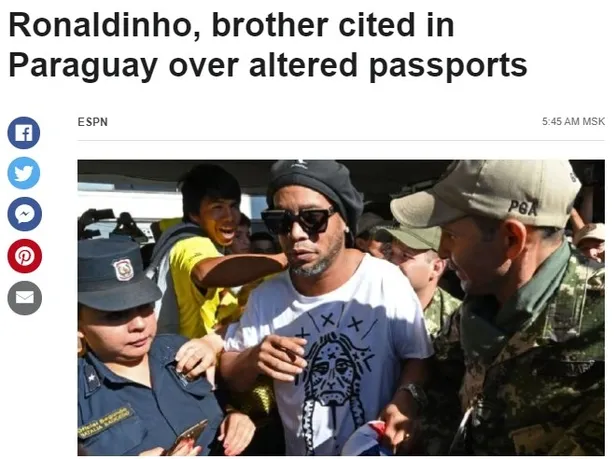 ESPN'de yer alan haberde, Paraguay'da düzenlenecek bir yardım etkinliğine katılmak için yola çıkan Ronaldinho ile kardeşi Assis, pasaport kontrolü sırasında yakalandı. Kendilerini Paraguay vatandaşı gibi göstermeye çalışan Ronaldinho ile kardeşi gözaltına alındı. Paraguay devlet kaynaklarından yapılan açıklamada ikiliyle ilgili adli soruşturma başlatıldığı ve tutuklanıp tutuklanmayacaklarıyla ilgili kararın beklendiği belirtildi.