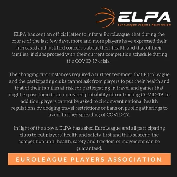 Dünyada corona virüsün hızla yayılması ve NBA'in aldığı sezonu askıya alma kararının ardından Euroleague Oyuncular Birliği, maçların ertelenmesini talep etti.