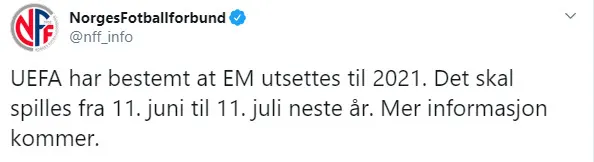 UEFA yaptığı değerlendirmeler neticesinde 12 Haziran'da başlaması beklenen EURO 2020'yi 1 yıl erteleme kararı aldı. Avrupa futbolunun beklediği dev organizasyon 11 Haziran -12 Temmuz 2021'de oynanacak. Resmi açıklama ilk olarak Norveç Futbol Federasyonu tarafından yapıldı.