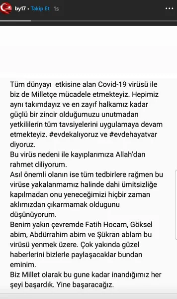 Tüm dünyayı etkisine alan Covid-19 virüsü ile biz de Milletçe mücadele etmekteyiz. Hepimiz aynı takımdayız ve en zayıf halkamız kadar güçlü bir zincir olduğumuzu unutmadan yetkililerin tüm tavsiyelerini uygulamaya devam etmekteyiz. #evdekalıyoruz ve #evdehayatvar diyoruz. Bu virüs nedeni ile kayıplarımıza Allah'tan rahmet diliyorum.
