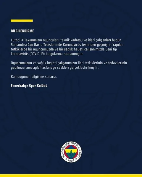 Futbol A Takımımızın oyuncuları, teknik kadrosu ve idari çalışanları bugün Samandıra Can Bartu Tesisleri'nde koronavirüs testinden geçmiştir. Yapılan tetkiklerde bir oyuncumuzda ve bir sağlık heyeti çalışanımızda yeni tip koronavirüs (COVID-19) bulgularına rastlanmıştır.